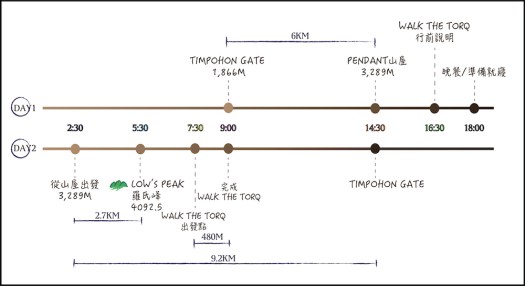 第一天從登山口至山屋,全程約6公里,上升1,423公尺;第二天從山屋攻頂羅氏峰約2.7公里,上升803公尺,再加上下山及高空索道,全程約9.2公里。兩天共15.2公里。
